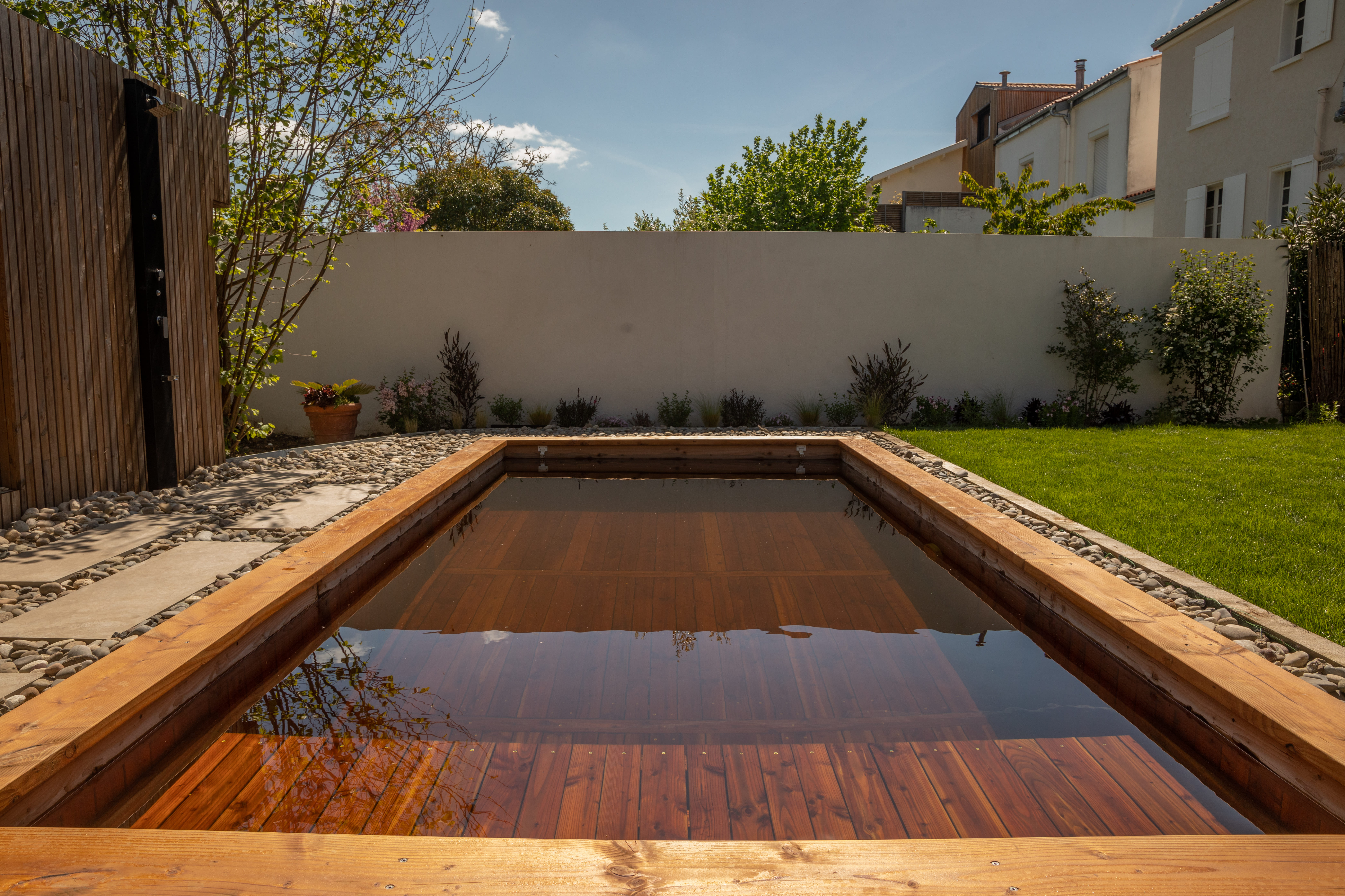 Cette réalisation met à l’honneur notre piscine naturelle en bois immergé, matériau durable et naturellement résistant, parfaitement intégré à l’environnement en Charente-Maritime.